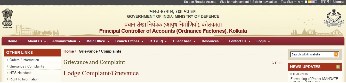 pcafys.gov.in Lodge Complaint/Grievance & Check Status Kolkata : Principal Controller of Accounts Ordnance Factories