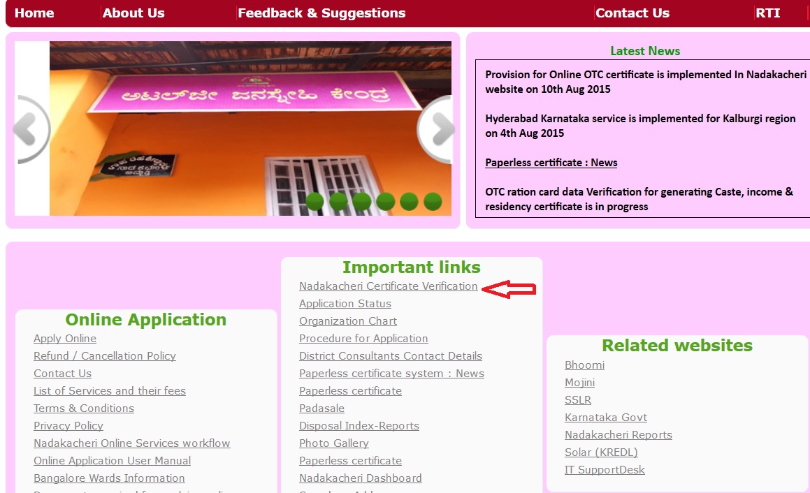 Nadakacheri Certificate Verification facility is offered by Government of Karnataka Revenue Department. Certificate will be displayed in Verification Site once the SMS for approval / Rejection is received.