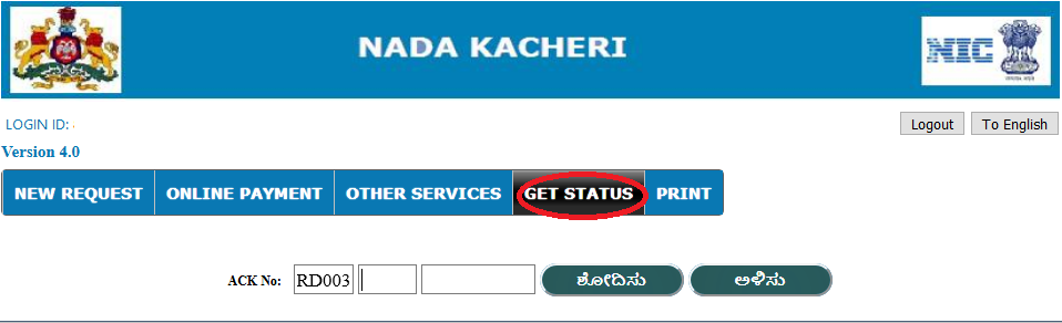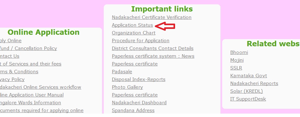 You can get status by entering acknowledgement number. You can check after login to your account. Also you can check by clicking application status link available in the home page of Nadakacheri in Karnataka.