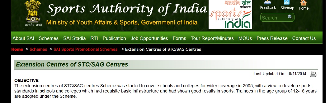 SAI Sports Authority of India Extension Centres of STC/SAG Centres Scheme : sportsauthorityofindia.nic.in