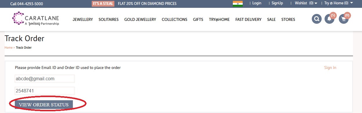 View Order Status Here : https://www.caratlane.com/sales/trackorder/index
