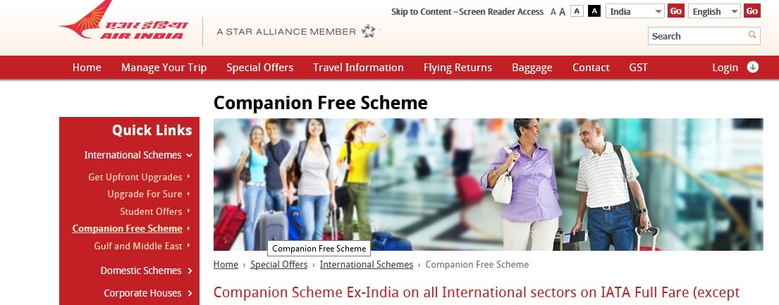 Air India offers the following Companion Scheme on IATA full fare (Fare Basis: FIF- First Class, CIF- Business Class, YIF – Economy class) ex India on all International sectors (except SAARC) for sale and travel commencing on/before 30th September 2016.