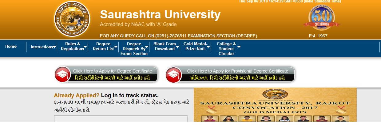 If you have applied online earlier then no need to apply now, if you haven’t received your degree certificate yet then, in this website, please check the list under “Degree Return List” Ever then, if you aren’t find your name in the list then please contact “Examination (Degree) Section, Saurashtra University, Rajkot”