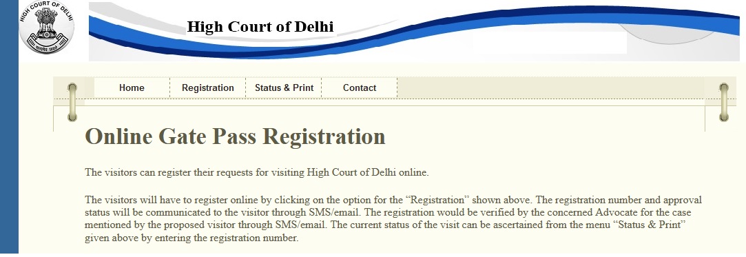The registration number/print-out of the registration would have to be presented by the intending visitor at the Gate Pass Counter of High Court of Delhi, along with the original proof of identity. After verifying the documents and after capturing the photograph of the intending visitor, visitor pass will be issued.