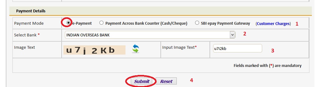 ** Select the Payment Mode Payment Across Bank Counter (Cash/Cheque)