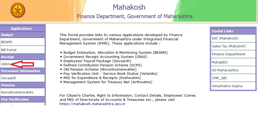 Go to the official website of Mahakosh Department, Maharashtra. Click GRAS link available in the list of applications in the left panel of website.