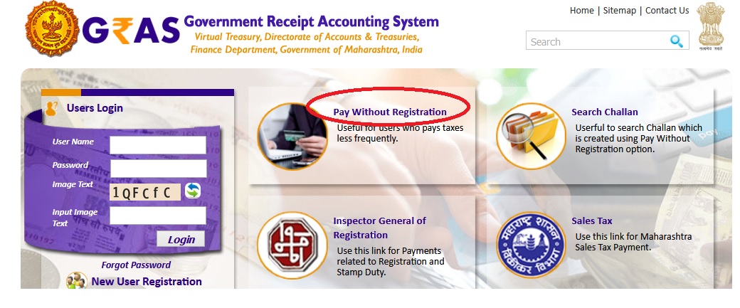 The purpose of this document is to provide complete details about the module “Payment without Registration”. It will help the user to make payment of Maharashtra Government taxes (GRAS Mahakosh) and non user should have Internet enabled banking account for epayment.