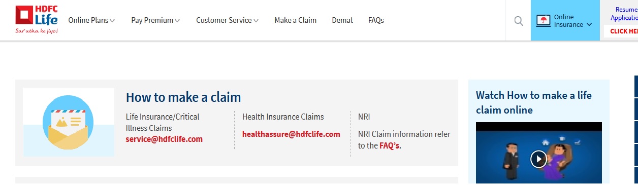 Website : http://www.hdfclife.com/customer-service/claims