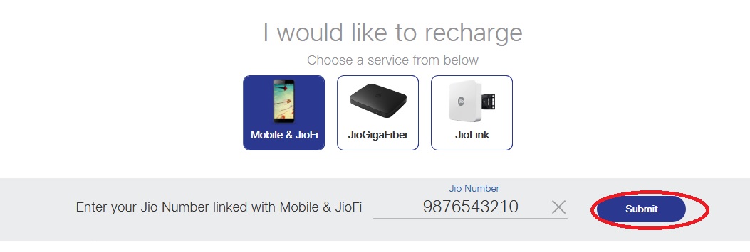 Enter Jio Number or Mobile Number or Email ID & Submit.