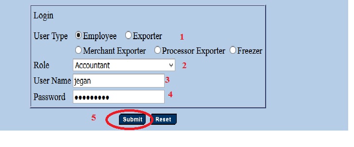 Step 1 : Select User Type /Employee Exporter/Merchant Exporter/Processor Exporter/Freezer