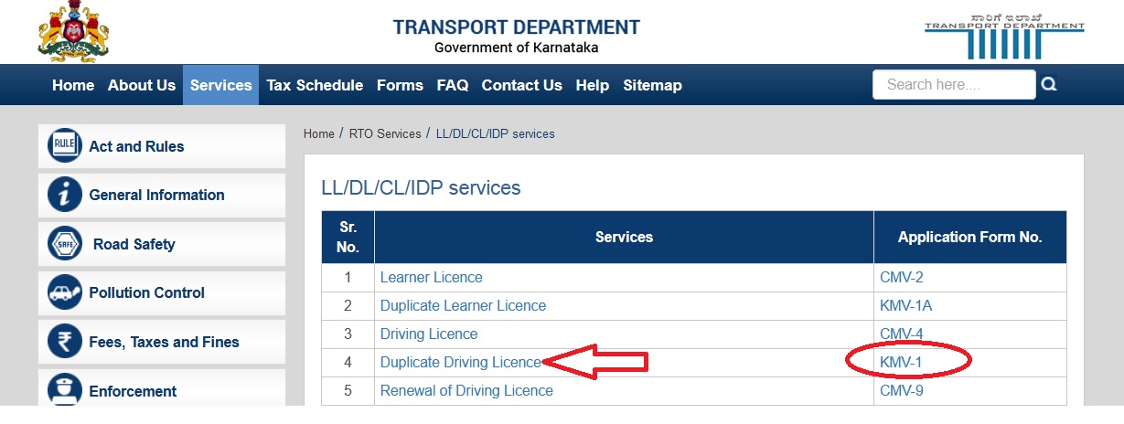 Go to the official website of RTO Karnataka, click on online services menu in LL/DL Services option in drop down list.