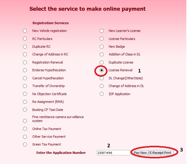 5. How can I know the renewal status of driving license with receipt number of fee remitted?