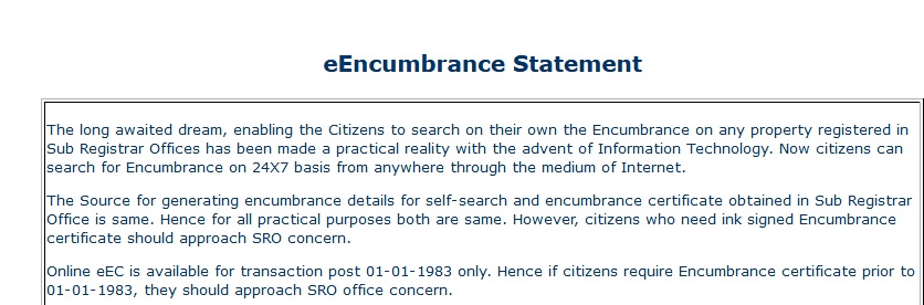 Online eEC is available for transaction post 01-01-1983 only. Hence if citizens require Encumbrance certificate prior to 01-01-1983, they should approach SRO office concern.