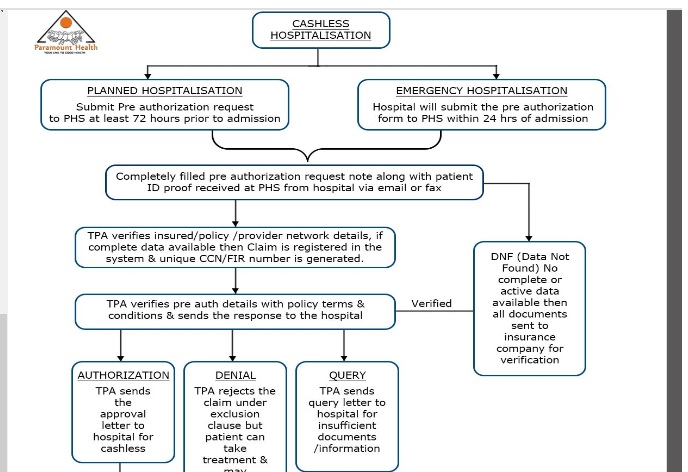 ** Insured has to arrange for the Admission Request Note to be sent across from respective network hospital to Paramount.Only expenses relating to hospitalisation will be reimbursed as per the policy taken. All non-medical expenses will not be reimbursed.