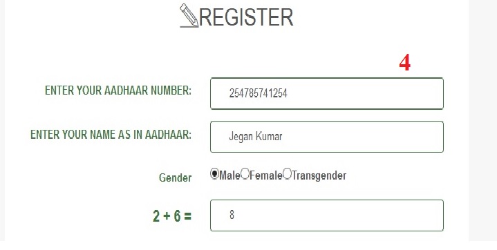 Step-4 : Then enter your Aadhaar Number and Name as per printed in your Aadhaar card. Select your Gender and then solve the simple addition problem provided in the register page just for verification.