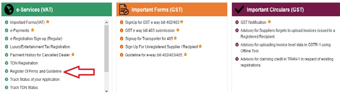1. Go to commercial Tax Home page -> E-services -> Register of Firms