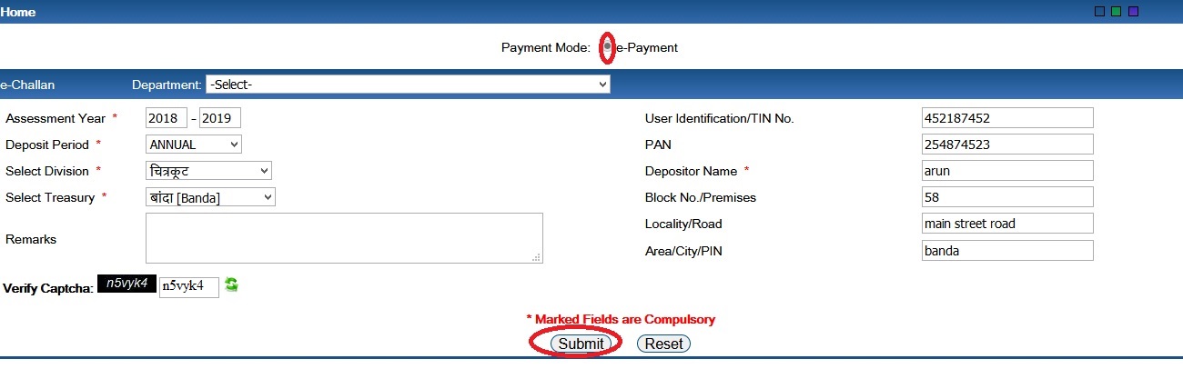** Finally click the Submit button to save the transaction for e-payment or Payment across bank counter mode.
