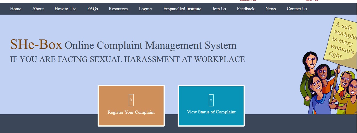 Any woman facing sexual harassment at workplace can register their complaint through this portal. Once a complaint is submitted to the ‘SHe-Box’, it will be directly sent to the concerned authority having jurisdiction to take action into the matter.