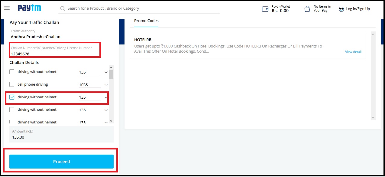 Step-3 : Enter the required details such as- Challan Number, RC Number, Vehicle Number, Driving License Number etc. Then slect the Challan Details and Click on ‘Proceed’