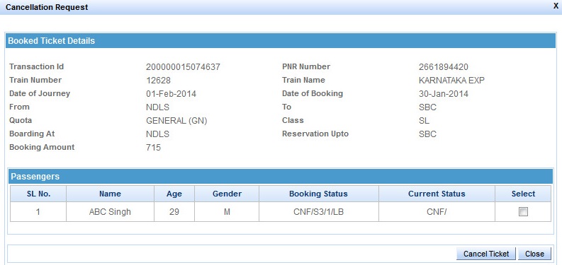 IRCTC E-Ticket : Cancel Train Ticket Online