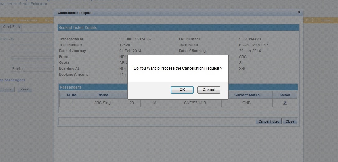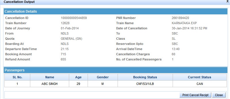 Step-2: User has to select only those passangers who are to be cancelled in case of partial cancellation of ticket. in case of partial cancellation the passanger should get a fresh printout of the ERS for the passangers continuing their journey.