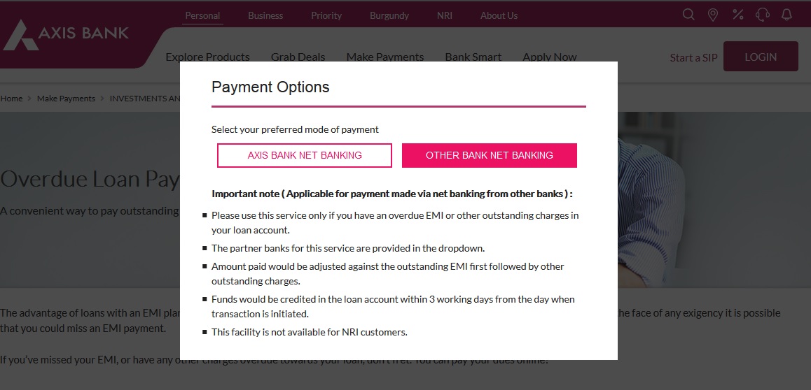 ** Click on ‘Make payments’ >> Loan Repayment >>Select ‘Axis bank’ >> Other Bank Net banking ->Enter the loan details