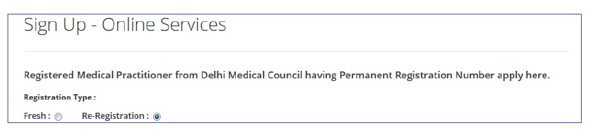 ** Please select the correct registration type while signup as Fresh registration type includes those doctors whose registration no starts with DMC/R/0, Please see your registration certificate before Signup in order to select the particular type of registration.