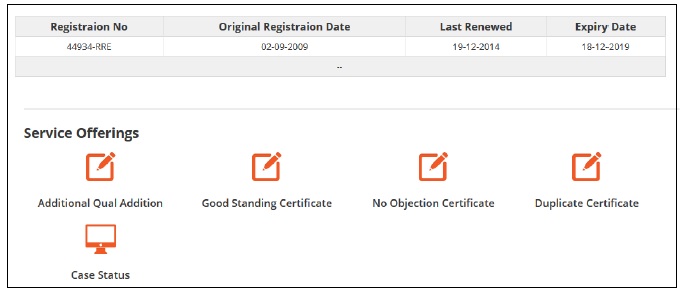 ** After Login you will get the option of to apply for Renewal (in case the renewal is due), Additional Qualification, Good Standing Certificate or No Objection Certification.