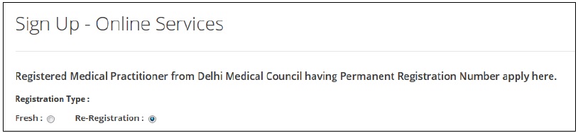 ** Please select the correct registration type while signup as Fresh registration type includes those doctors whose registration no starts with DMC/R/0, Please see your registration certificate before Signup in order to select the particular type of registration.