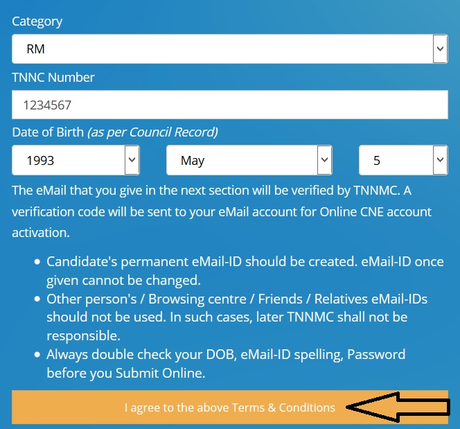 Choose your Category, enter your TNNMC Number and select your Date of Birth. Read eMail related information carefully and enter your valid eMail-ID.