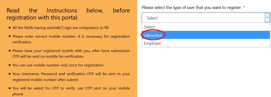Step 2 : Click on Register as on the top left, and select Jobseeker.