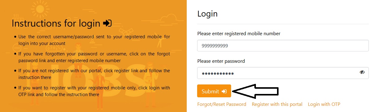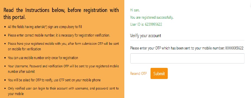 ** Your Username, Password and verification OTP will be sent to your registered mobile number after submit