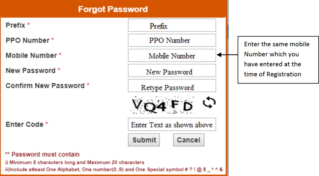 For example : If PPO Number is A0123654, then Prefix -> A and PPO Number -> 0123456 and enter the Password which is entered at the time of Registration.