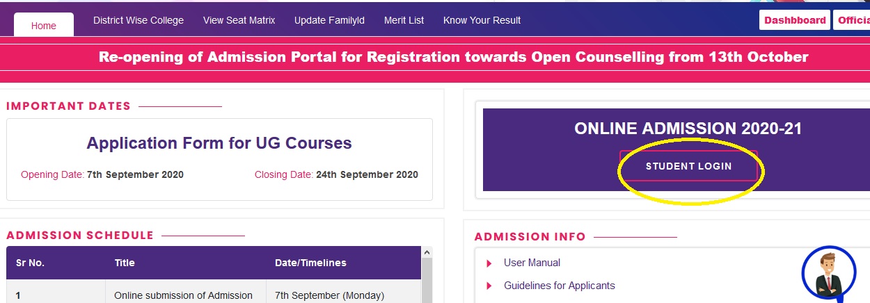 | 9 | Re-opening of Admission Portal for Registration towards Open Merit Lists/Counselling & Editing of Courses/Colleges by the remaining applicants who did not get admission in First & Second Merit List Closing Date: 18th October 2020 | 13th October (Tuesday) to 18th October (Sunday) |