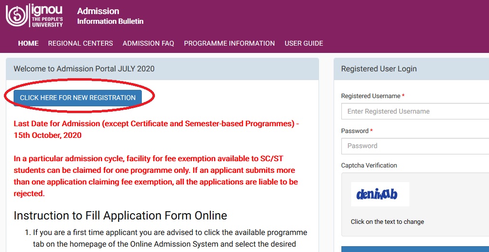 Last Date for Admission (except Certificate and Semester-based Programmes) – 15th October, 2020