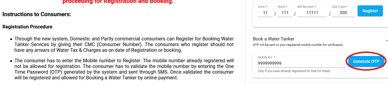 ** Through the new system, Domestic and Partly commercial consumers can Register for Booking Water Tanker Services by giving their CMC (Consumer Number).