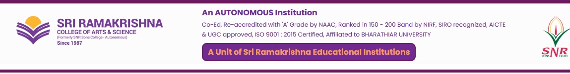 Sri Ramakrishna College of Arts and Science (Formerly SNR Sons College) is a renowned Arts and Science college in the country, where excellence is tradition. It is situated at the heart of the city and has a beautiful campus sprawling over an area of 15.9 acres with excellent infrastructure. It is affiliated to Bharathiar University and accredited by National Assessment and Accreditation Council since 2001, with Grade ‘A’ in its 3rd cycle.
