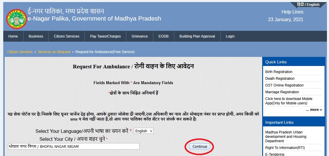 MP e-Nagar Palika Portal Free Ambulance Service Request.