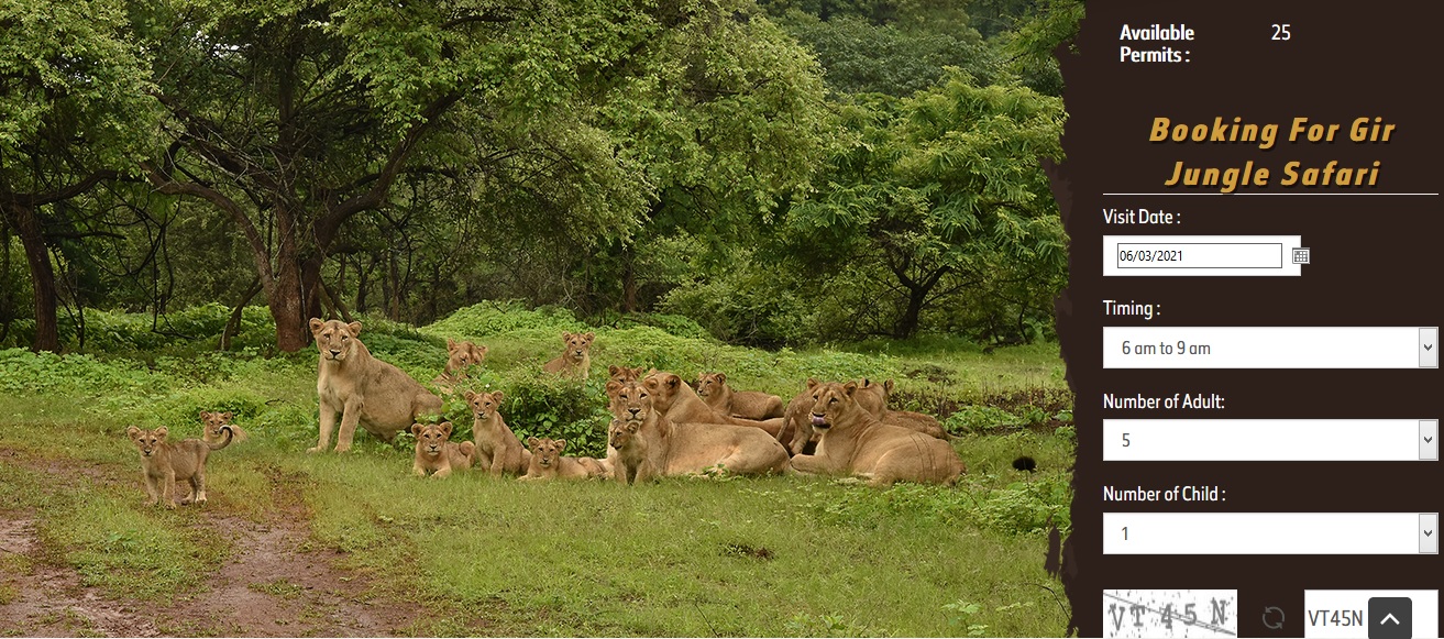 ** The services such as the issue of duplicate permit tickets for lost/mutilated/torn permits and bulk booking for more than 6 people (for Gir Jungle Safari and Girnar Nature Safari) will not be provided.