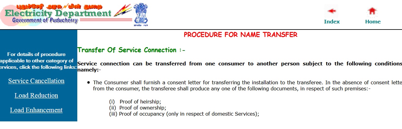 Home Page : http://electricity.puducherry.gov.in/service/name_transfer.htm