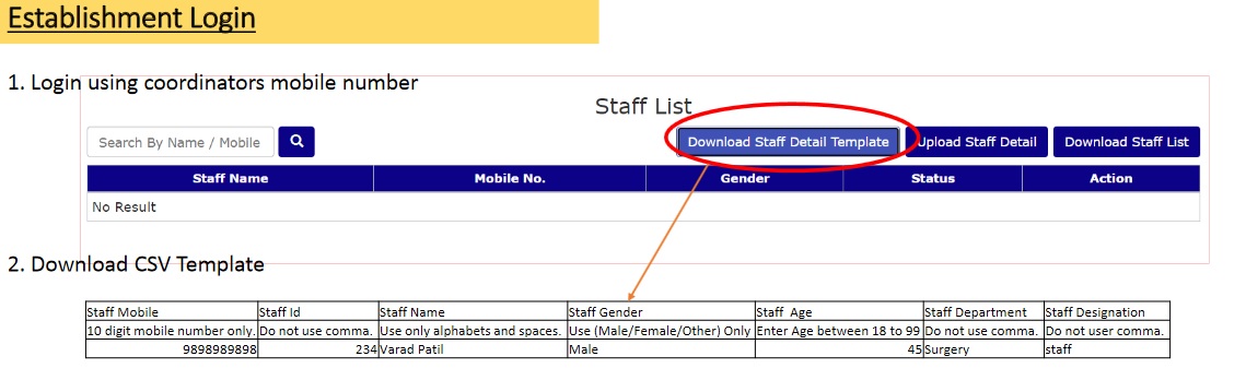 ** Coordinator can upload the staff details using CSV template provided on website.