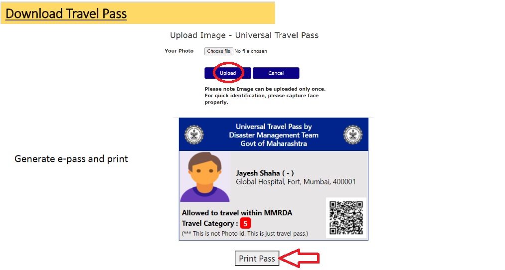 2. Upload photo (One time) to generate Maharashtra Universal Travel Pass