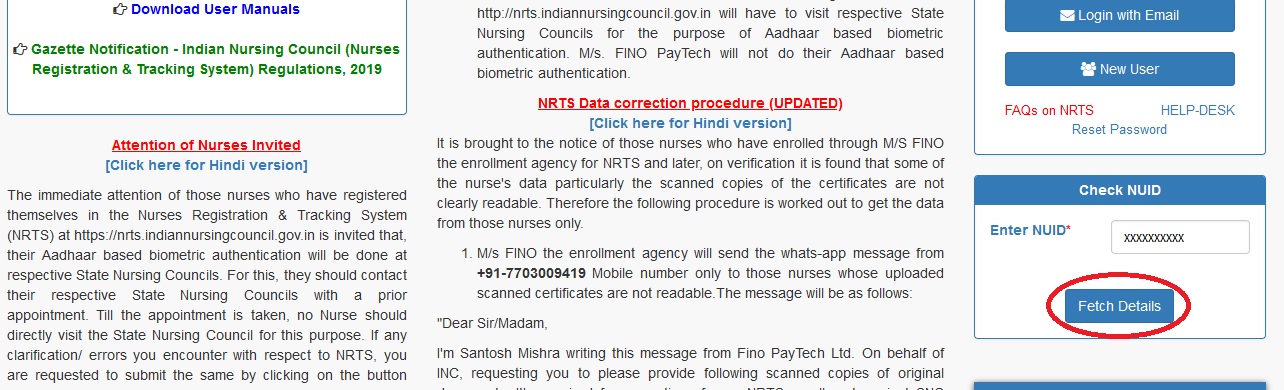 Indian Nursing Council, Nurses Registration & Tracking System (NRTS). Nurses who have enrolled themselves through internet at https://nrts.indiannursingcouncil.gov.in/login.nic will have to visit respective State Nursing Councils for the purpose of Aadhaar based biometric authentication. M/s. FINO PayTech will not do their Aadhaar based biometric authentication.