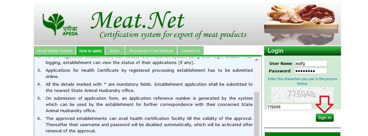 To apply Health Certificate online, for the export consignment of meat products, the establishment on registration with APEDA shall be provided a one time Username and Password.