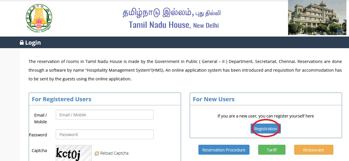 An online application system has been introduced recently and requisition for accommodation has to be sent by the guests using the online application. This online application system is part of Tamil Nadu House’s website. In case of any difficulty in applying through the online system , the following alternate arrangement can be used for room reservation.