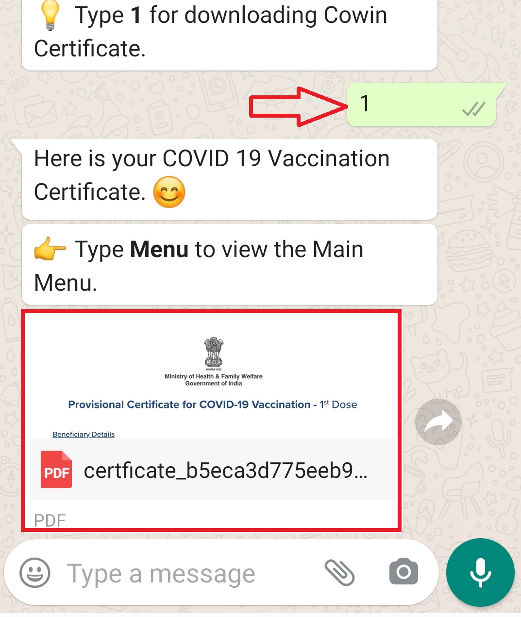 Step-5 : Then type 1 to download the Covid Vaccination Certificate in PDF format.