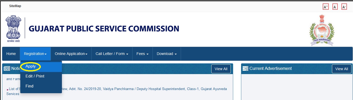 1. Visit https://gpsc-ojas.gujarat.gov.in home page. Click on “Registration”->Apply
