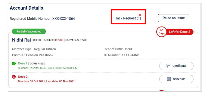 Once an issue has been raised by the beneficiary, a new tab “Track Request” appears on the Account details page. Beneficiaries can track the status of the raised issues using this feature