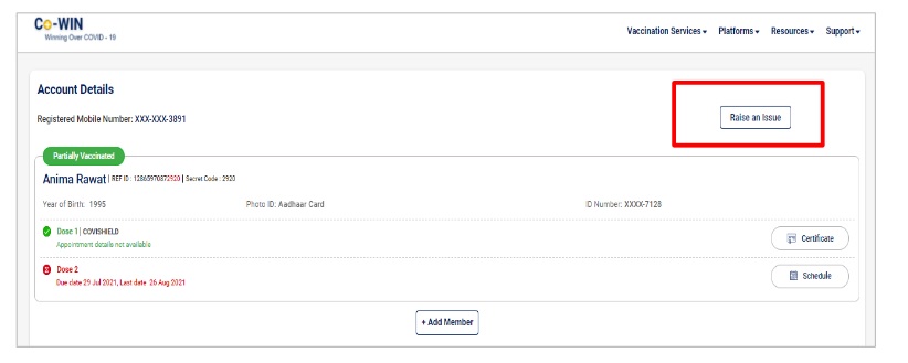 Only those beneficiaries who have received at least first dose of vaccination can raise an issue in the Co-WIN portal
