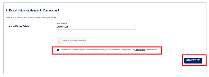 Step-6: Click on the declaration that the request will revoke vaccination certificates and remove members from your account